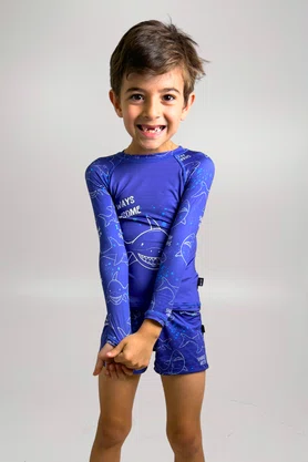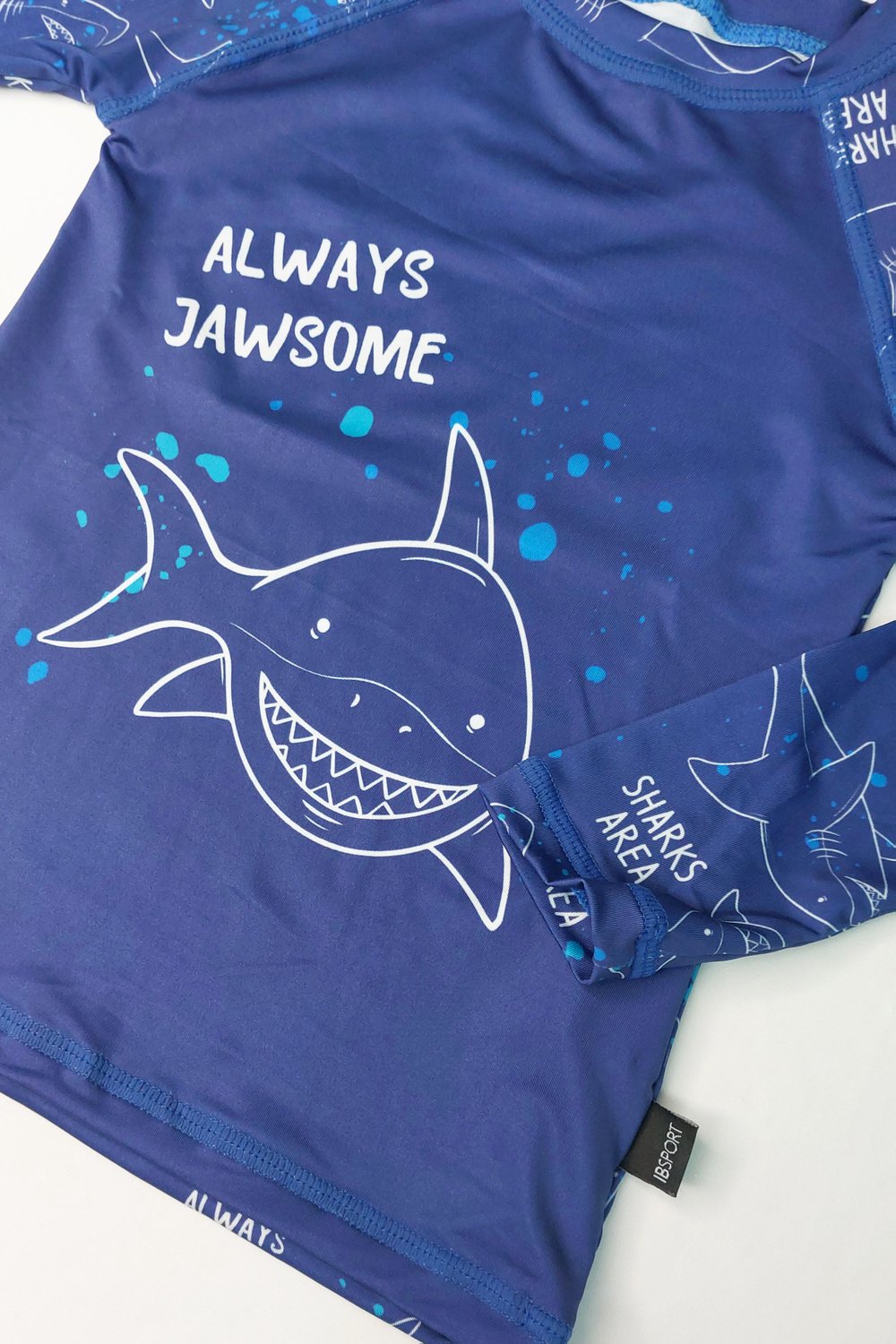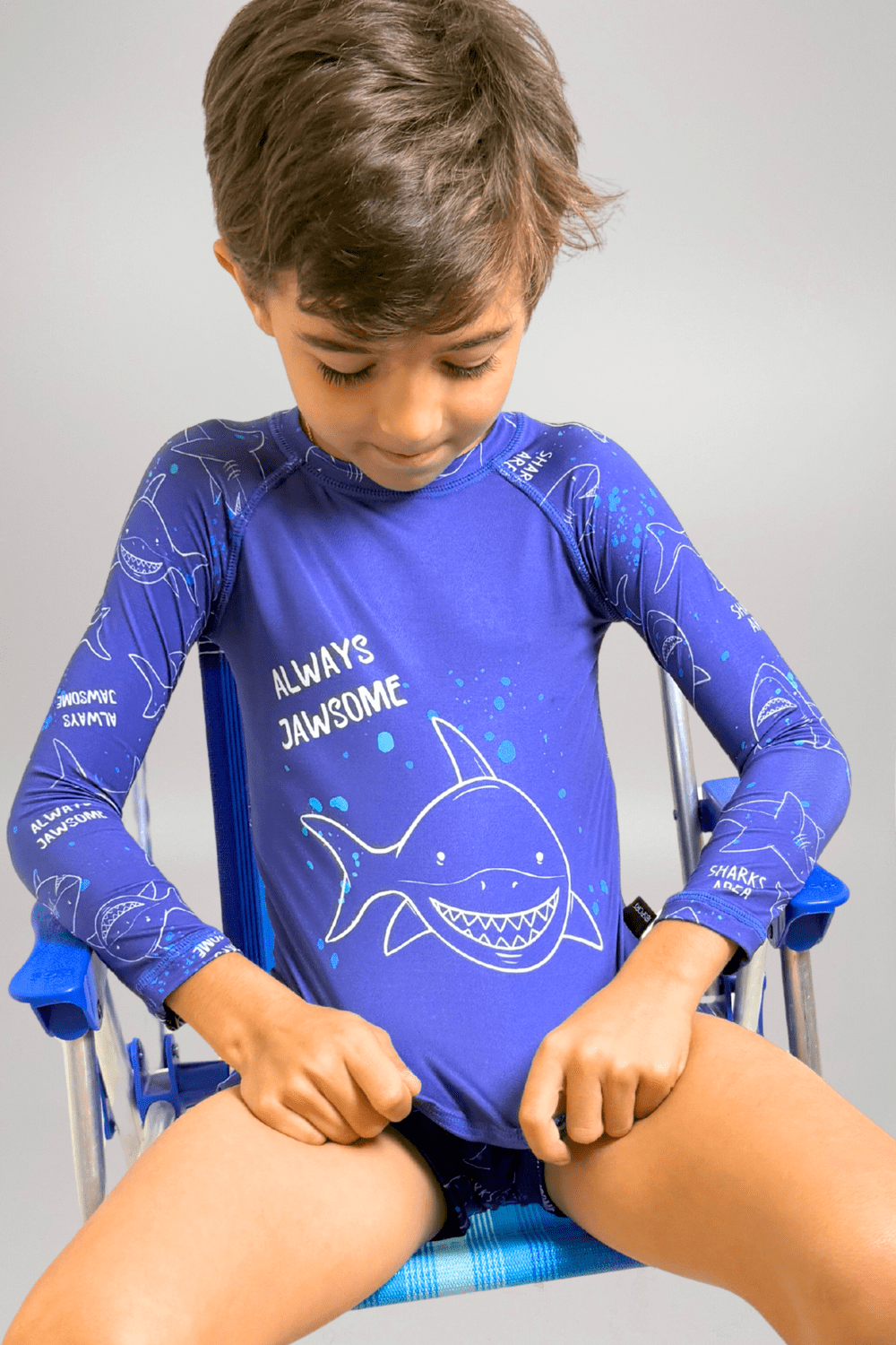 Diversão e proteção para os dias de sol! Nossa blusa infantil com proteção UV 50+ foi feita para acompanhar os pequenos nas brincadeiras ao ar livre, mantendo a pele protegida dos raios solares. Mangas longas em modelo raglan. Com exclusiva estampa de tubarão sobre um fundo azul marinho, ela traz um toque de diversão ao visual, além de tecido leve, confortável e de secagem rápida — perfeita para praia, piscina ou parque!