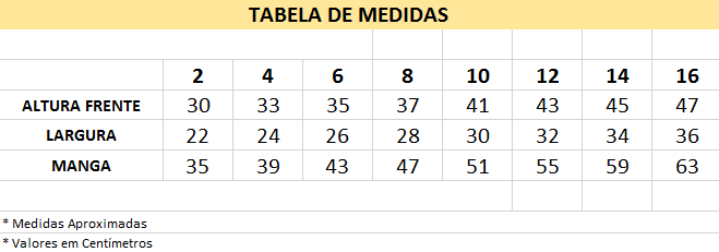 * Disponível nos tamanhos 02, 04, 06, 08, 10, 12, 14 e 16