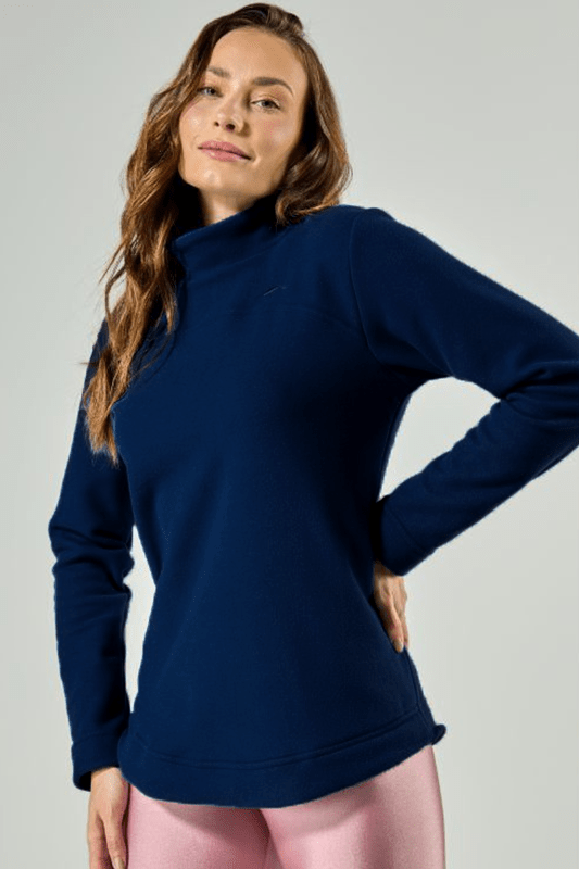 O toque super macio e que esquenta sem pesar! Blusão em tecido soft, em gola alta e bolsos laterais. Detalhe de barra arredondada, o que alonga a silhueta. Uma peça versátil que combina tanto com legging como em looks mais urbanos. Cor azul marinho.