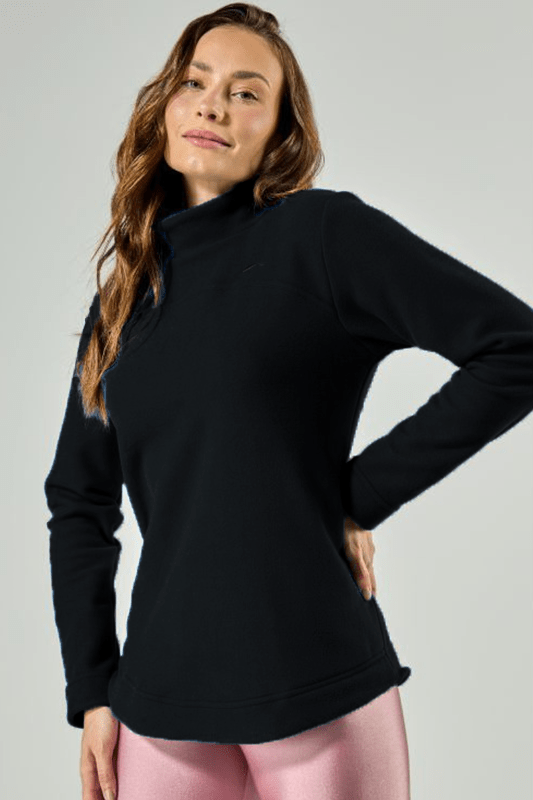 O toque super macio e que esquenta sem pesar! Blusão em tecido soft, em gola alta e bolsos laterais. Detalhe de barra arredondada, o que alonga a silhueta. Uma peça versátil que combina tanto com legging como em looks mais urbanos. Cor preta.