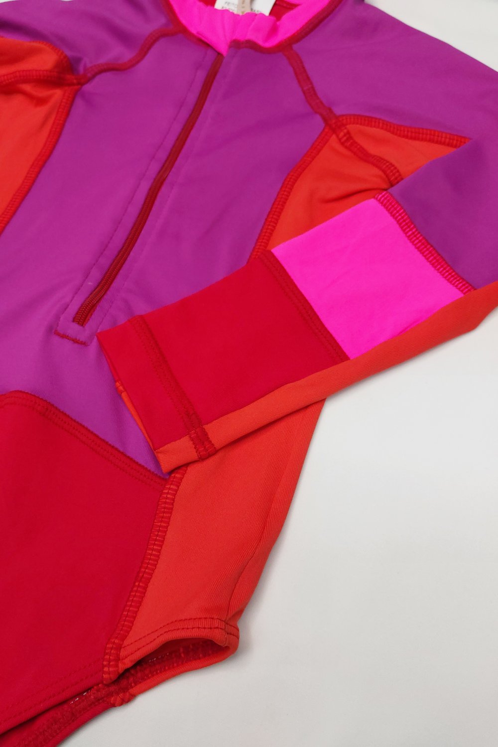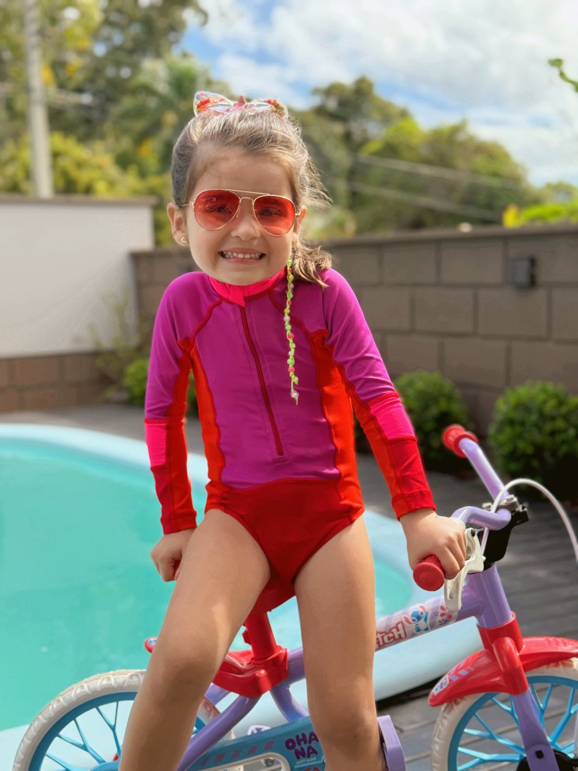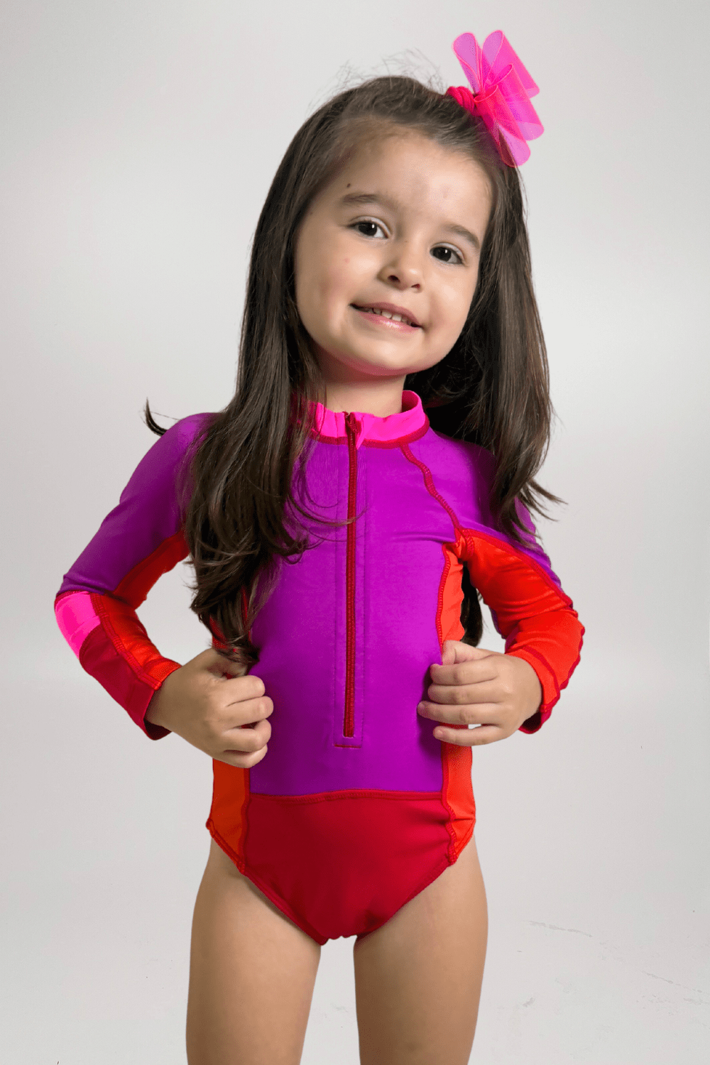 O look perfeito para acompanhar cada momento de sol com muita cor e proteção! Este body infantil foi desenvolvido com tecido com proteção UV, garantindo segurança contra os raios solares enquanto a criança brinca à vontade na praia, piscina ou ao ar livre. As mangas são longas em modelo raglan, zíper frontal e gola levemente alongada. Com uma combinação vibrante de magenta, vermelho, laranja e rosa neon, ele une estilo e personalidade conquistando tanto as pequenas quanto as mamães que amam praticidade.