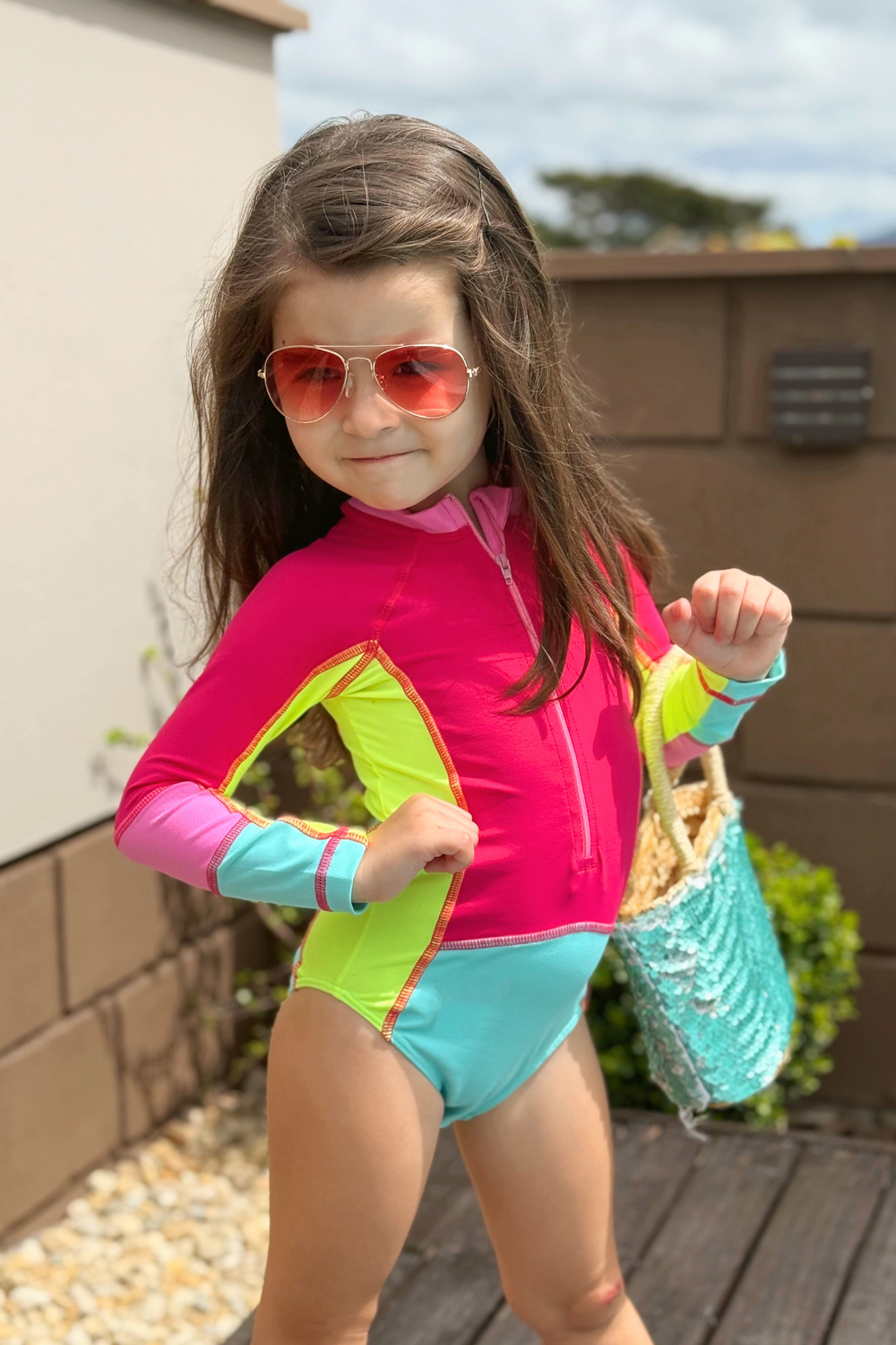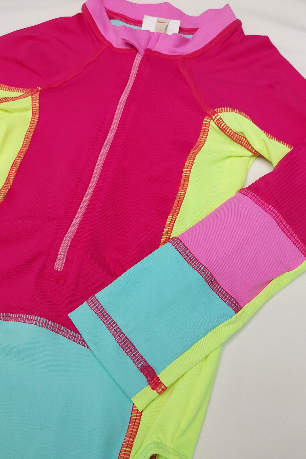 O look perfeito para acompanhar cada momento de sol com muita cor e proteção! Este body infantil foi desenvolvido com tecido com proteção UV, garantindo segurança contra os raios solares enquanto a criança brinca à vontade na praia, piscina ou ao ar livre. As mangas são longas em modelo raglan, zíper frontal e gola levemente alongada. Com uma combinação vibrante de rosa, verde neon e verde água, ele une estilo e personalidade conquistando tanto as pequenas quanto as mamães que amam praticidade.