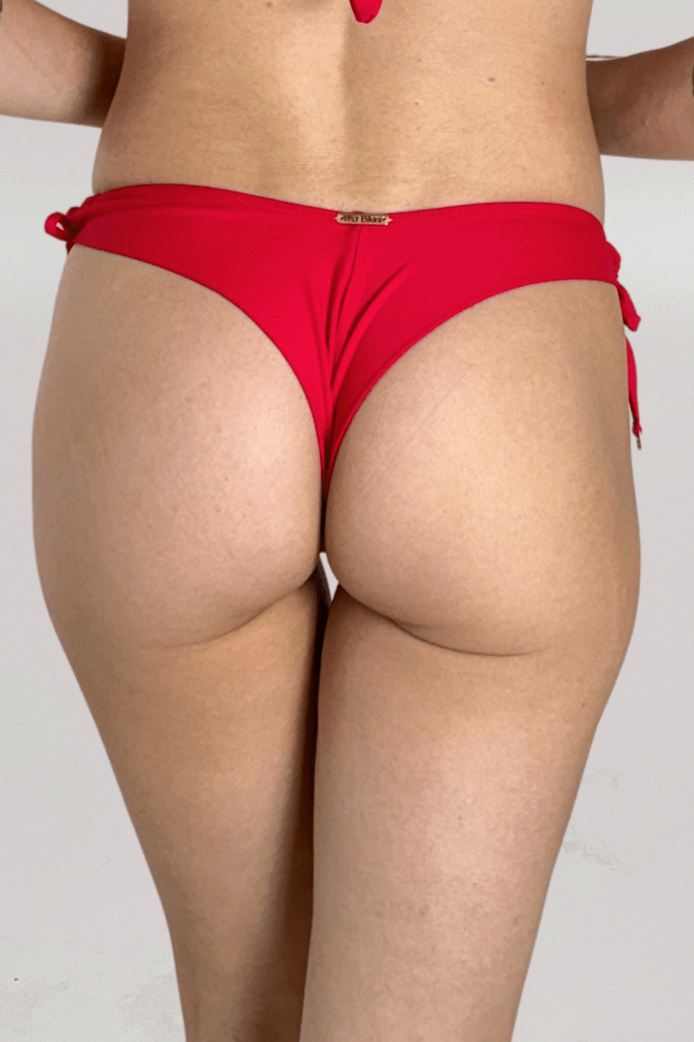 Calcinha Daniela, em modelo fio, as laterais são compostas por rolotês para amarração na medida desejada, acabamento com ponteiras em dourado. Em vermelho, o forro é nude.