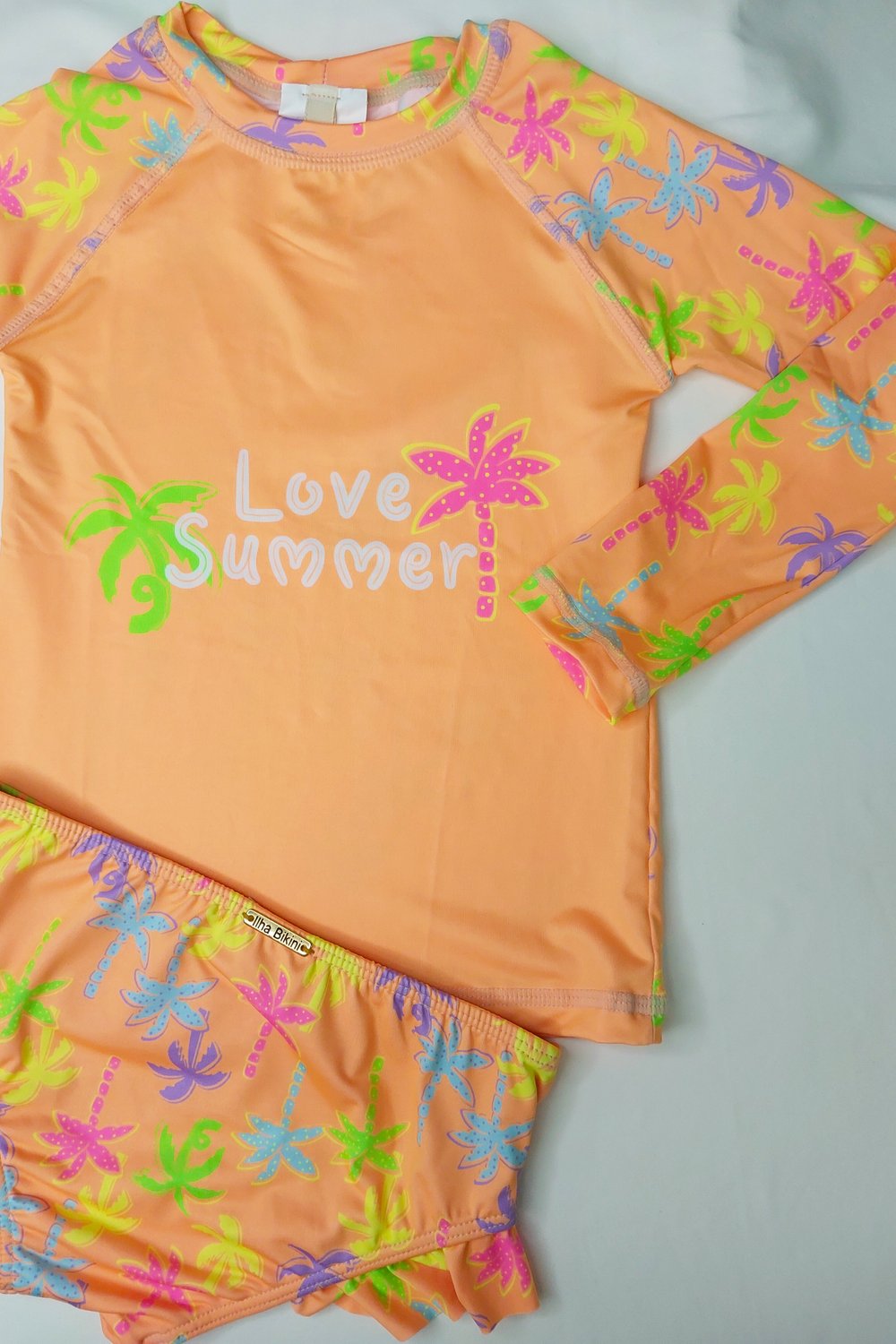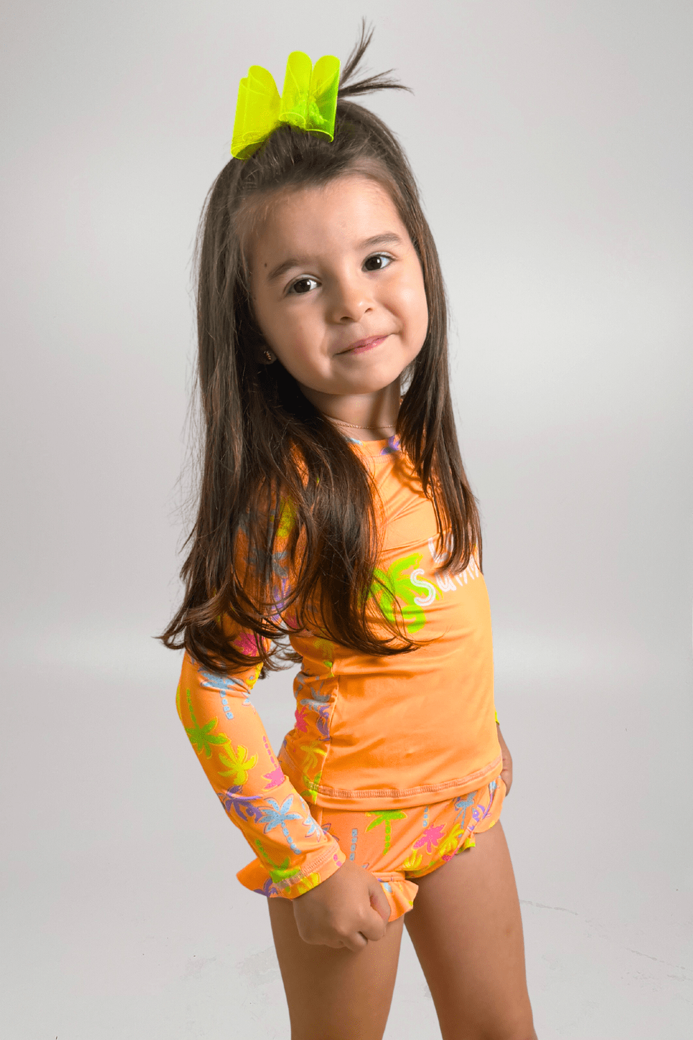 Calcinha infantil super charmosa e cheia de personalidade! Com modelagem maior e detalhe em babadinhos na barra, ela garante conforto, segurança e liberdade para brincar à vontade. Em exclusiva estampa de coqueiros sobre um fundo laranja neon, o forro é nude.