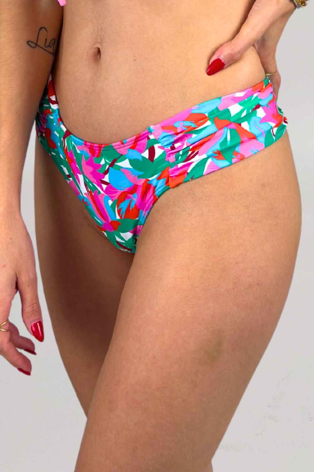 Calcinha Noronha, a clássica Confort, agora com as costas em modelo semi fio. As laterais são médias e franzidas. Em colorida estampa floral nas cores verde, branco e rosa, as costas são duplas, já a frente possui forro nude. Uma peça moderna e confortável que possui inúmeras possibilidades de combinações.