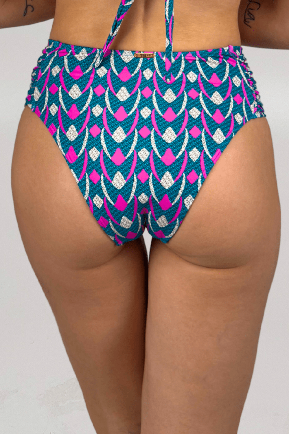 A calcinha mais vendida da Ilha, em modelagem maior! Calcinha Praia Brava conta com laterais mais largas e drapeadas, permitindo o ajuste para mais ou menos. Em tecido confortável, se ajusta ao corpo sem apertar. Estampa de triângulos em tons de verde e pink.