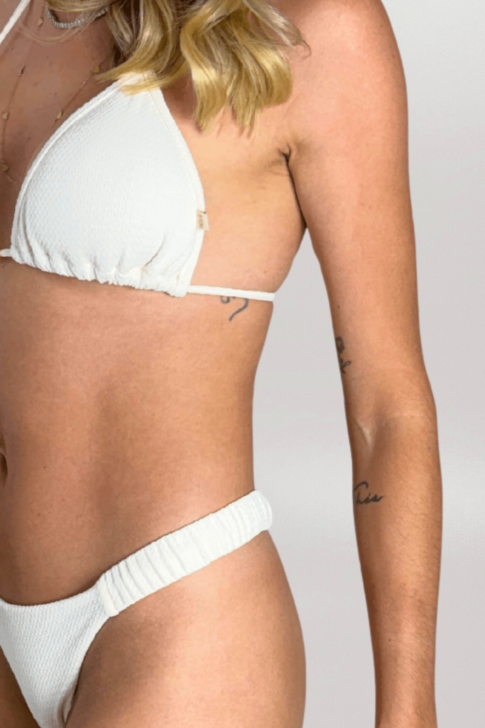 A calcinha Praia Mole conta com laterais finas e franzidas. As costas, em modelo semi fio, são duplas, já a frente conta com forro preto. O detalhe especial da peça fica no tecido, com textura e na cor off white.