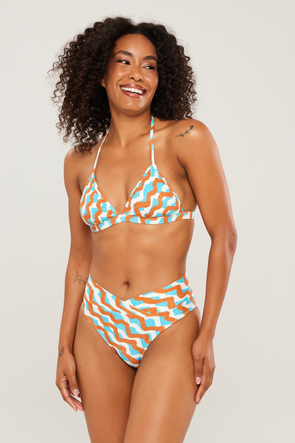 Um modelo diferenciado. A calcinha Quatro Ilhas possui o cós, que é largo, transpassado formando um V na frente. Em estampa em tons de caramelo e azul sob um fundo off, o forro é nude.