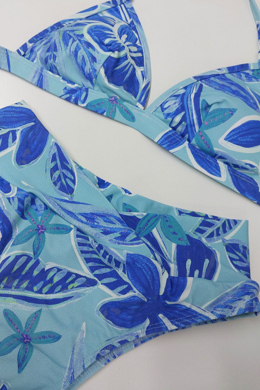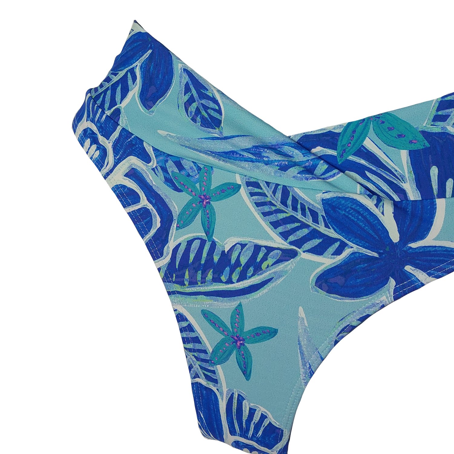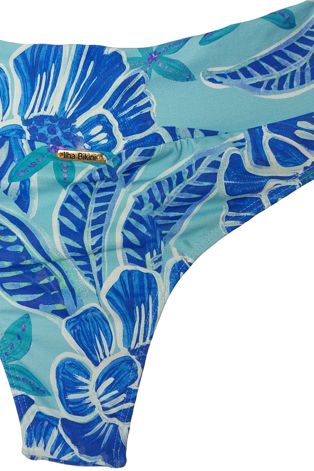Um modelo diferenciado. A calcinha Quatro Ilhas possui o cós, que é largo, transpassado formando um V na frente. Em estampa de folhas e flores em tons de azul, o forro é nude.