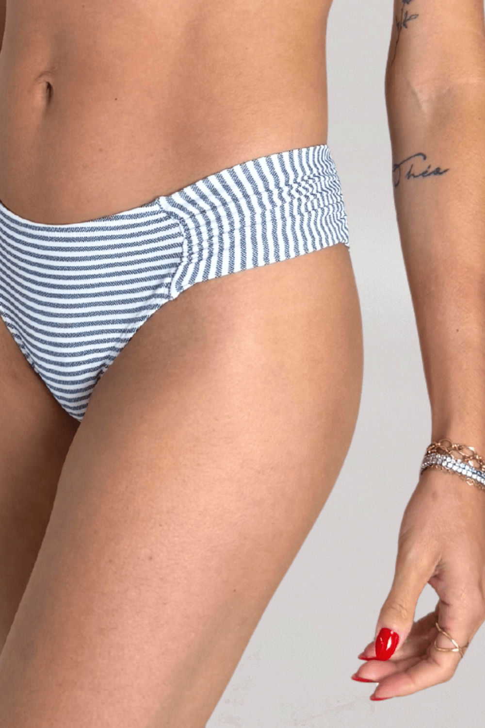 Nosso modelo mais vendido, a Calcinha Trancoso (a amada Confort) possui laterais médias e franzidas. Extremamente confortável, é uma peça que se ajusta ao corpo sem apertar. Estampa de finas listras em tons de azul e branco, possui forro nude.