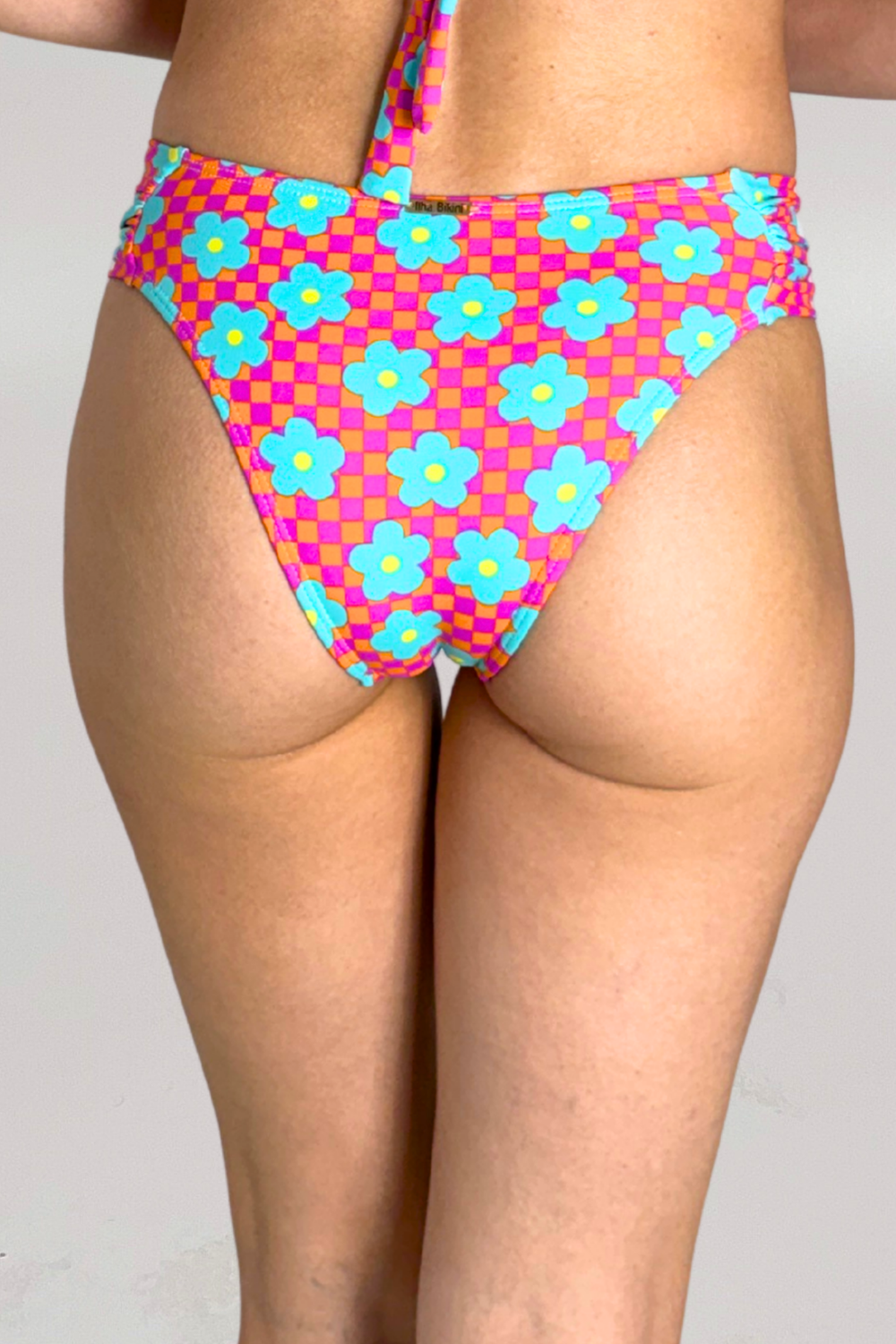 Nosso modelo mais vendido, a Calcinha Trancoso (a amada Confort) possui laterais médias e franzidas. Extremamente confortável, é uma peça que se ajusta ao corpo sem apertar. Estampa xadrez em rosa e laranja com flores, possui forro nude.