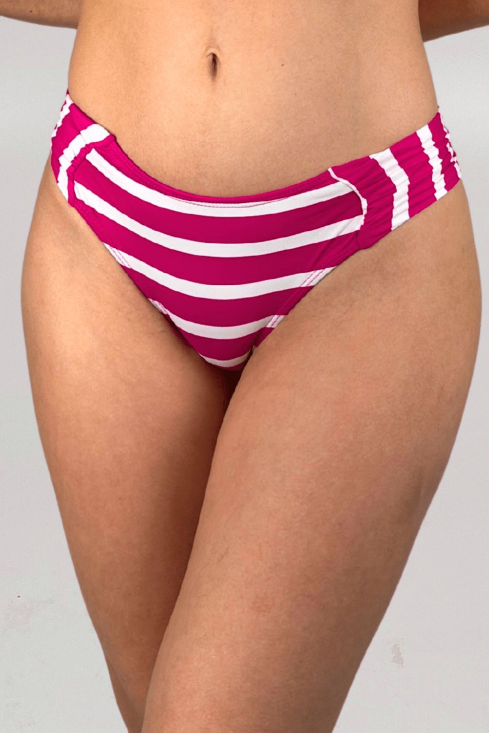 Nosso modelo mais vendido, a Calcinha Trancoso (a amada Confort) possui laterais médias e franzidas. Extremamente confortável, é uma peça que se ajusta ao corpo sem apertar. Estampa de listras em rosa e branco, possui forro nude.