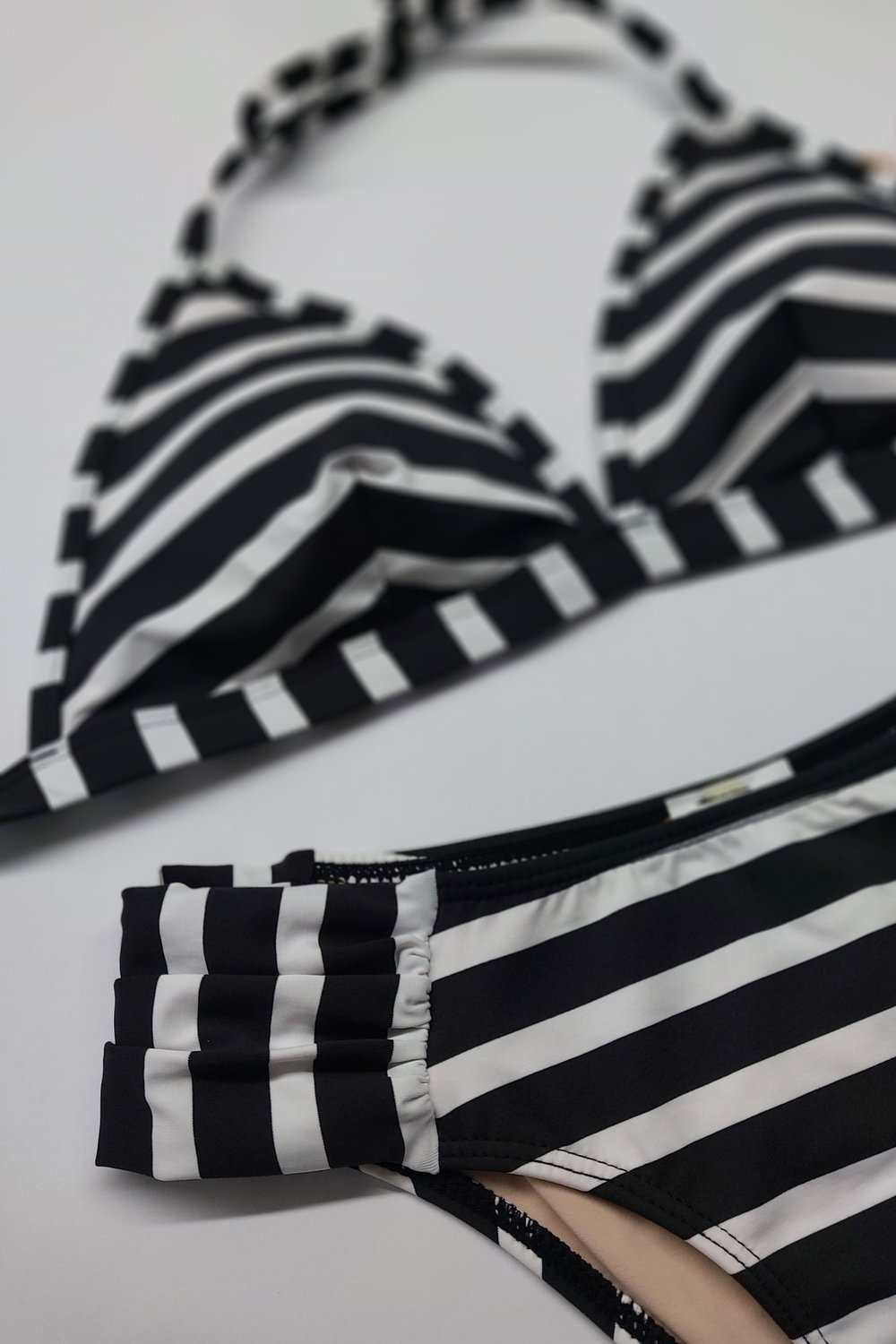 Nosso modelo mais vendido, a Calcinha Trancoso (a amada Confort) possui laterais médias e franzidas. Extremamente confortável, é uma peça que se ajusta ao corpo sem apertar. Estampa de listras, possui forro nude.