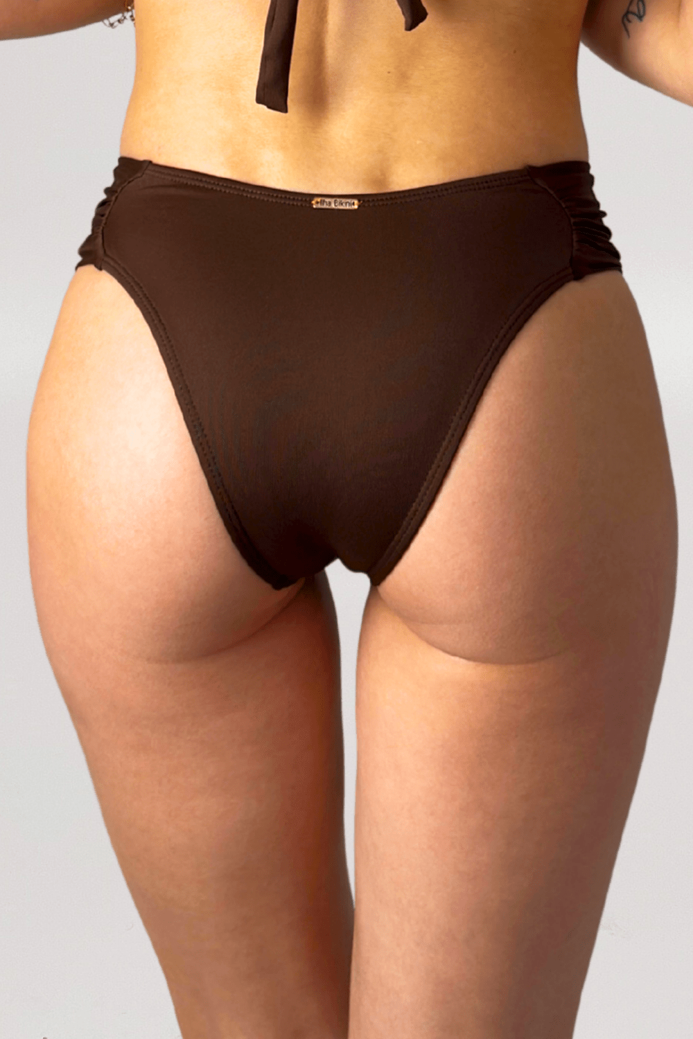 Nosso modelo mais vendido, a calcinha Trancoso possui laterais médias e franzidas. Extremamente confortável, é uma peça que se ajusta ao corpo sem apertar. Na cor marrom, possui forro nude.