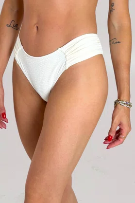 Nosso modelo mais vendido, a Calcinha Trancoso possui laterais médias e franzidas. Extremamente confortável, é uma peça que se ajusta ao corpo sem apertar. Com o diferencial do tecido, com textura. Cor off white.