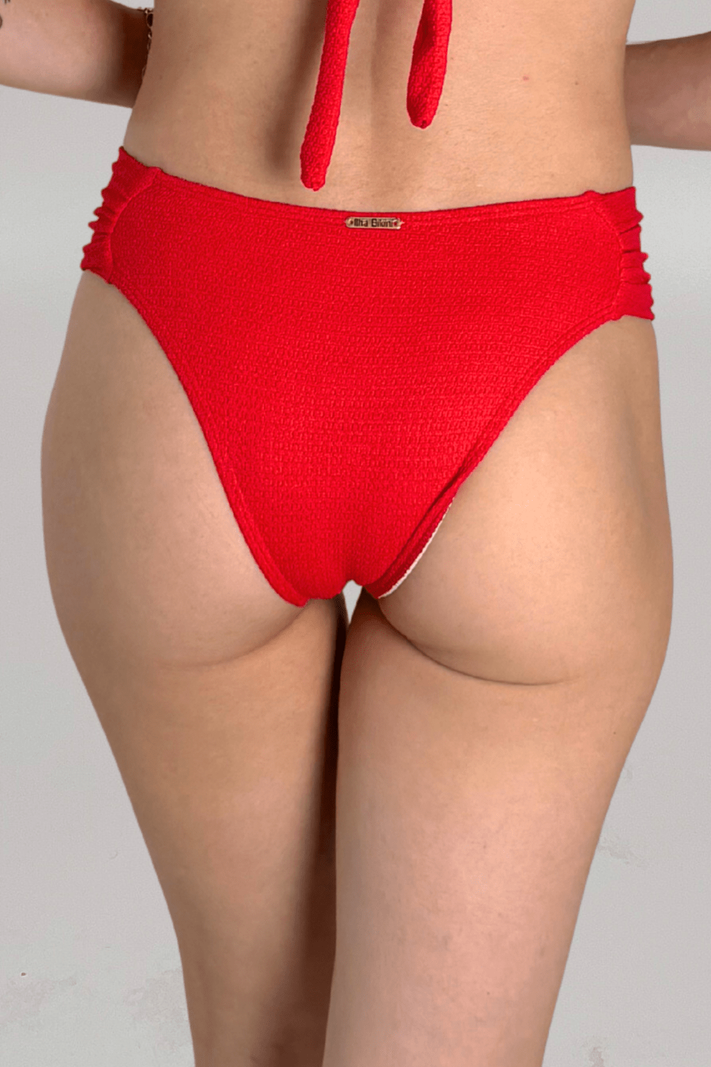 Nosso modelo mais vendido, a Calcinha Trancoso possui laterais médias e franzidas. Extremamente confortável, é uma peça que se ajusta ao corpo sem apertar. Com o diferencial do tecido, com textura canelada levemente cintilante. Em vermelho.