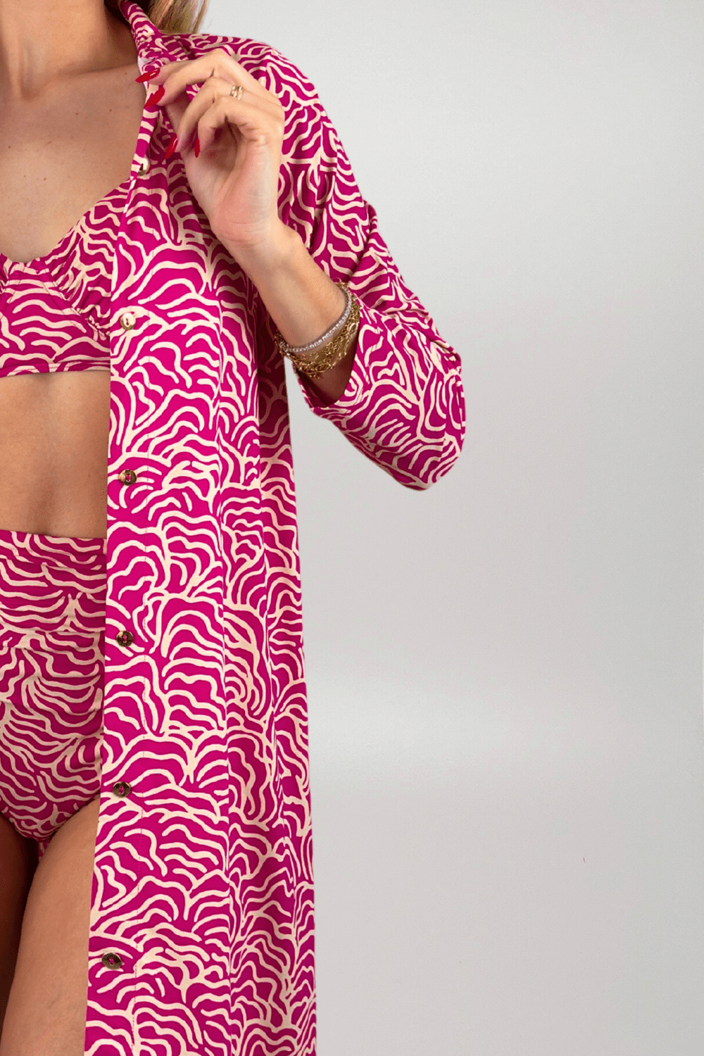 Com toque leve e modelagem elegante, a saída de praia Amores em estilo camisa é a escolha perfeita para transitar com charme da areia ao pós-praia. Confeccionada em tecido geladinho e fluido, proporciona frescor e conforto ao vestir. Possui mangas 7/8, recortes laterais que garantem leveza no caimento e botões dourados que adicionam um toque sofisticado ao visual. Em estampa com o mesmo padrão de um modelo de biquíni e maiô da coleção, é ideal para compor um look completo e harmonioso nos dias de sol. Versátil, também pode compor looks para o dia a dia. Estampa abstrata em tons de off e pink.