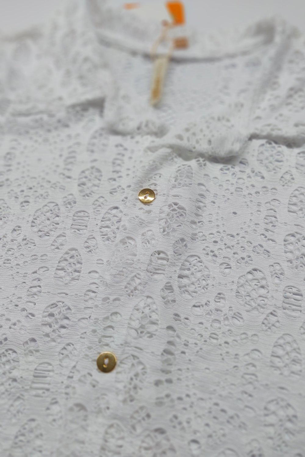 Leve elegância e charme para seus dias de sol com a saída de praia Jericoacoara, estilo camisa. Confeccionada em renda, ela garante um visual sofisticado e ao mesmo tempo leve e arejado. Com modelagem soltinha, mangas 7/8 e fechamento frontal com botões dourados, é a peça perfeita para compor looks estilosos à beira-mar ou à beira da piscina. Use sobre biquínis ou maiôs e transforme sua produção em um visual chic sem esforço. Branca.