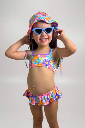 Um conjunto que alia uma modelagem moderna com estampa delicada para as pequenas arrasarem nesse verão! Top inteiro, o diferencial fica por conta das alças, que são 2, fininhas e na cor azul e rosa. A calcinha, em modelagem maior, conta com babado em todo o cós. Em exclusiva estampa de flores coloridas, o forro é nude.