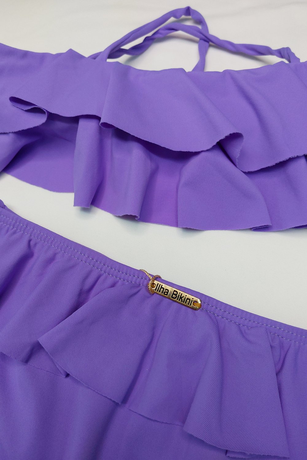 O biquíni perfeito para as pequenas que amam cor e movimento! Com modelagem confortável e babados delicados tanto no top quanto na calcinha, esse conjunto traz um visual super alegre e cheio de personalidade. Alças fininhas e cruzadas nas costas com amarração ajustável garantindo maior segurança e conforto. As camadas de babados criam um efeito delicado. Cor violeta.