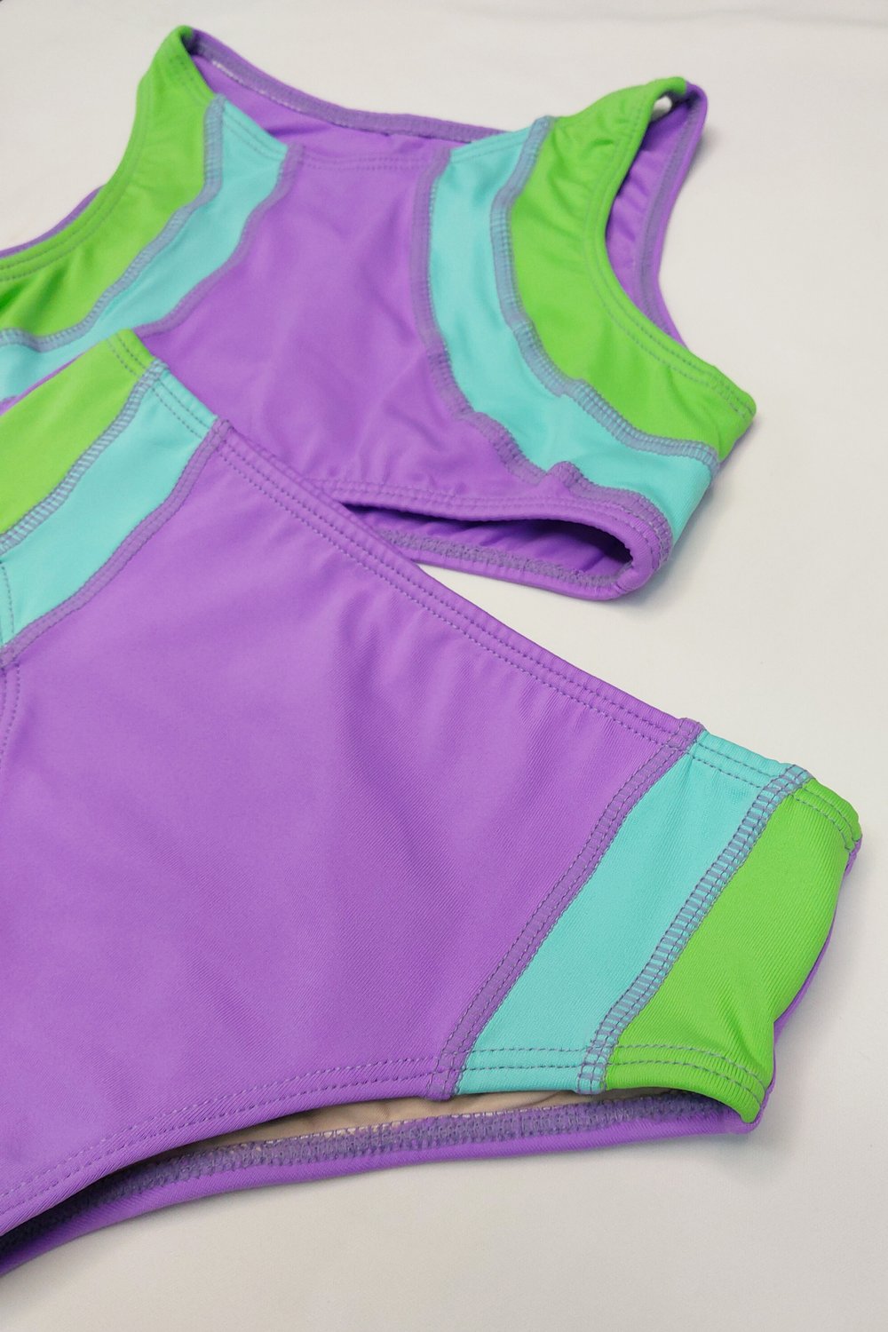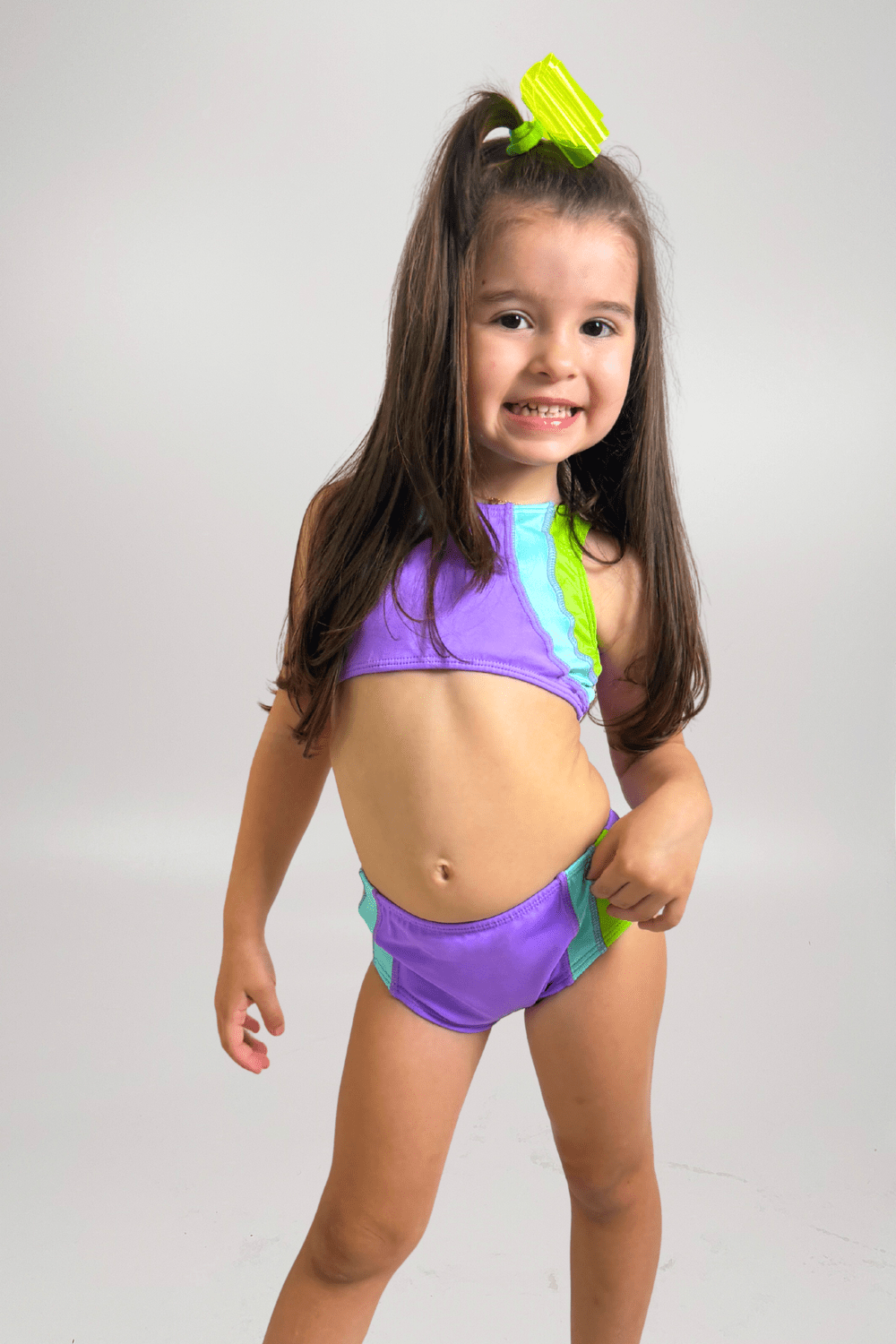 Com modelagem anatômica e tecido macio de secagem rápida, esse conjunto garante liberdade para brincar à vontade. Com alta cobertura, são peças confortáveis que garantem segurança para a sua pequena. Na cor ametista, possui recortes em tons de verde. Forro nude.