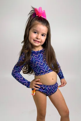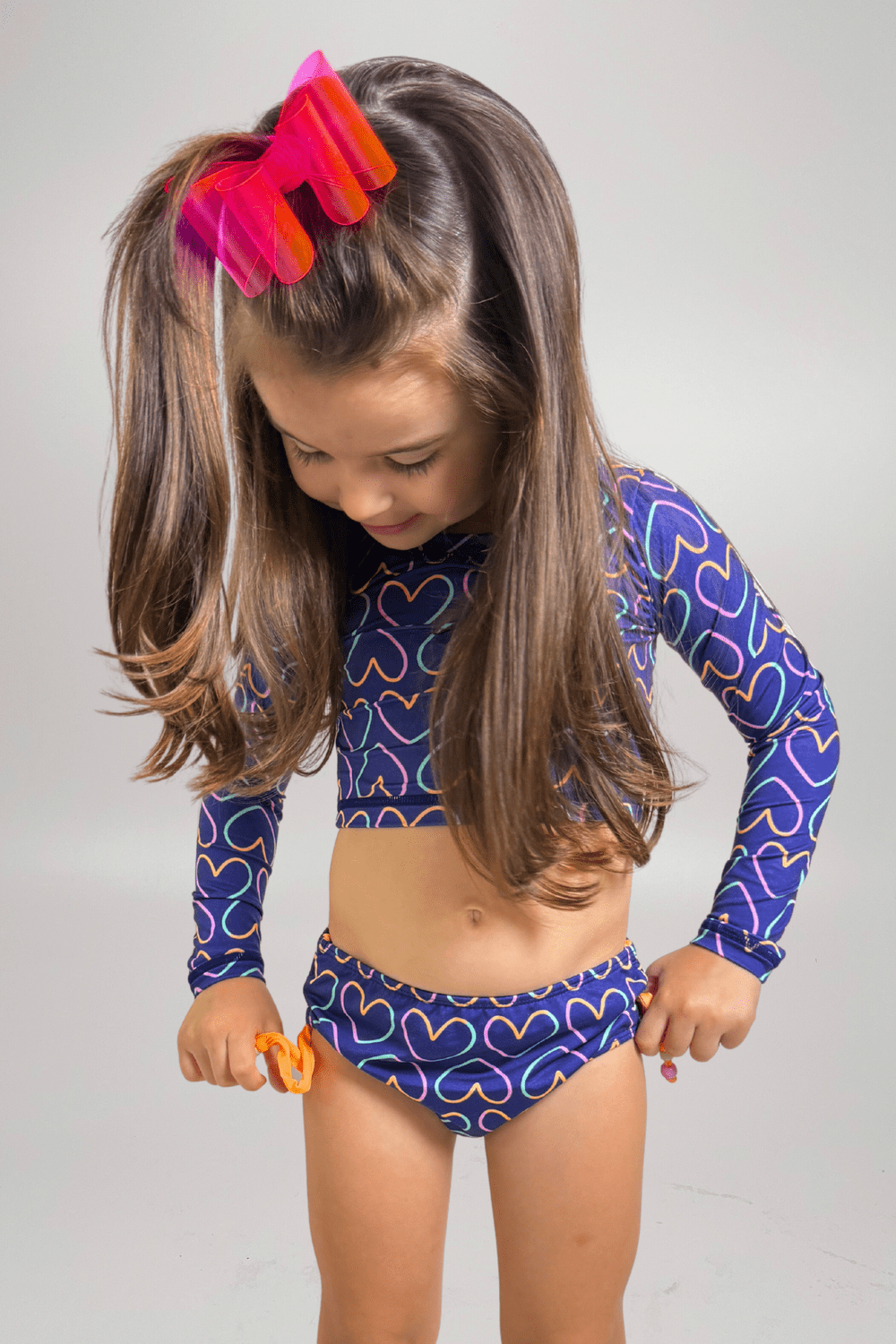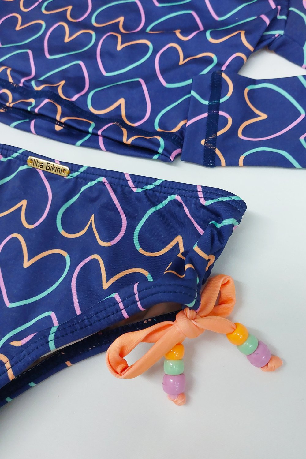 Conforto e muita proteção para as pequenas! Um conjunto composto por blusa de manga longa e modelagem cropped e calcinha com as laterais com possibilidade de amarração para franzio mais ou menos. Em estampa de coloridos corações sobre um fundo azul marinho, a calcinha conta com rolotês rosa e miçangas também coloridas.