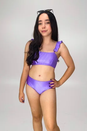 Confortável, estiloso e cheio de personalidade, temos o conjunto perfeito para as meninas que amam aproveitar os dias de sol com muito charme! O top possui alças com babadinhos delicados, trazendo um toque fun e feminino ao look, além de oferecer ótima sustentação. A calcinha tem modelagem confortável, com encaixe perfeito no corpo e visual atual. O tecido canelado com brilho suave garante ainda mais destaque e é tendência absoluta na moda praia. Ideal para praia, piscina, férias e qualquer momento de diversão ao ar livre. Cor lilás.