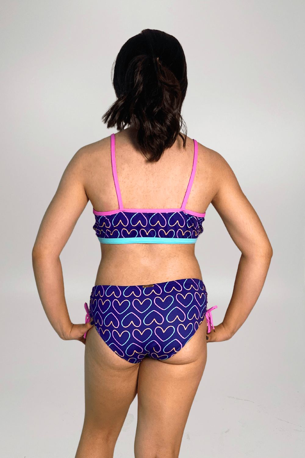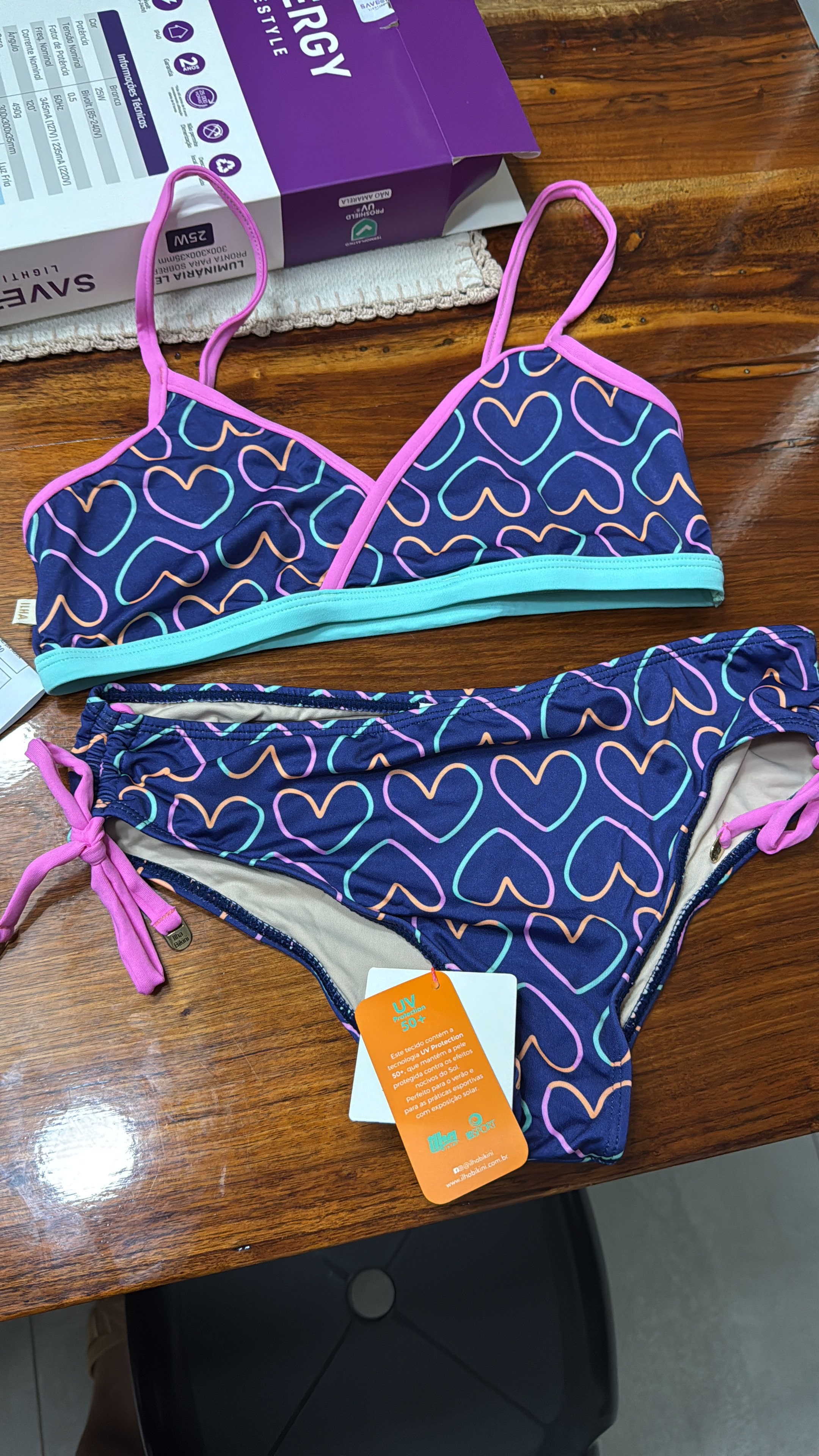 Conforto, estilo e aquele toque moderno que toda garota ama! Nosso conjunto juvenil é perfeito para os dias de sol — leve, fresquinho e cheio de personalidade! O top com detalhe transpassado valoriza o visual com um caimento lindo, enquanto a parte de baixo garante conforto e liberdade para curtir o dia inteiro. A estampa de delicados corações sobre um fundo azul marinho em combinação com os detalhes tanto do sutiã como amarração da calcinha são a finalização perfeita nessa peça estilosa e super moderna.