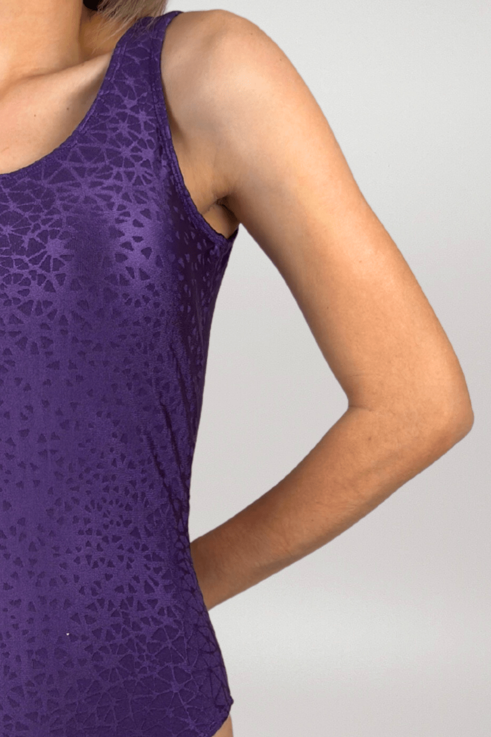 Um clássico aqui na Ilha, o maiô Amores é uma peça discreta, elegante e muito confortável. Ele conta com alças mais larguinhas e decote nas costas em U. Possui bojo. Aqui, em sua versão texturizado, na cor uva com acabamento levemente cintilante, o forro é nude.