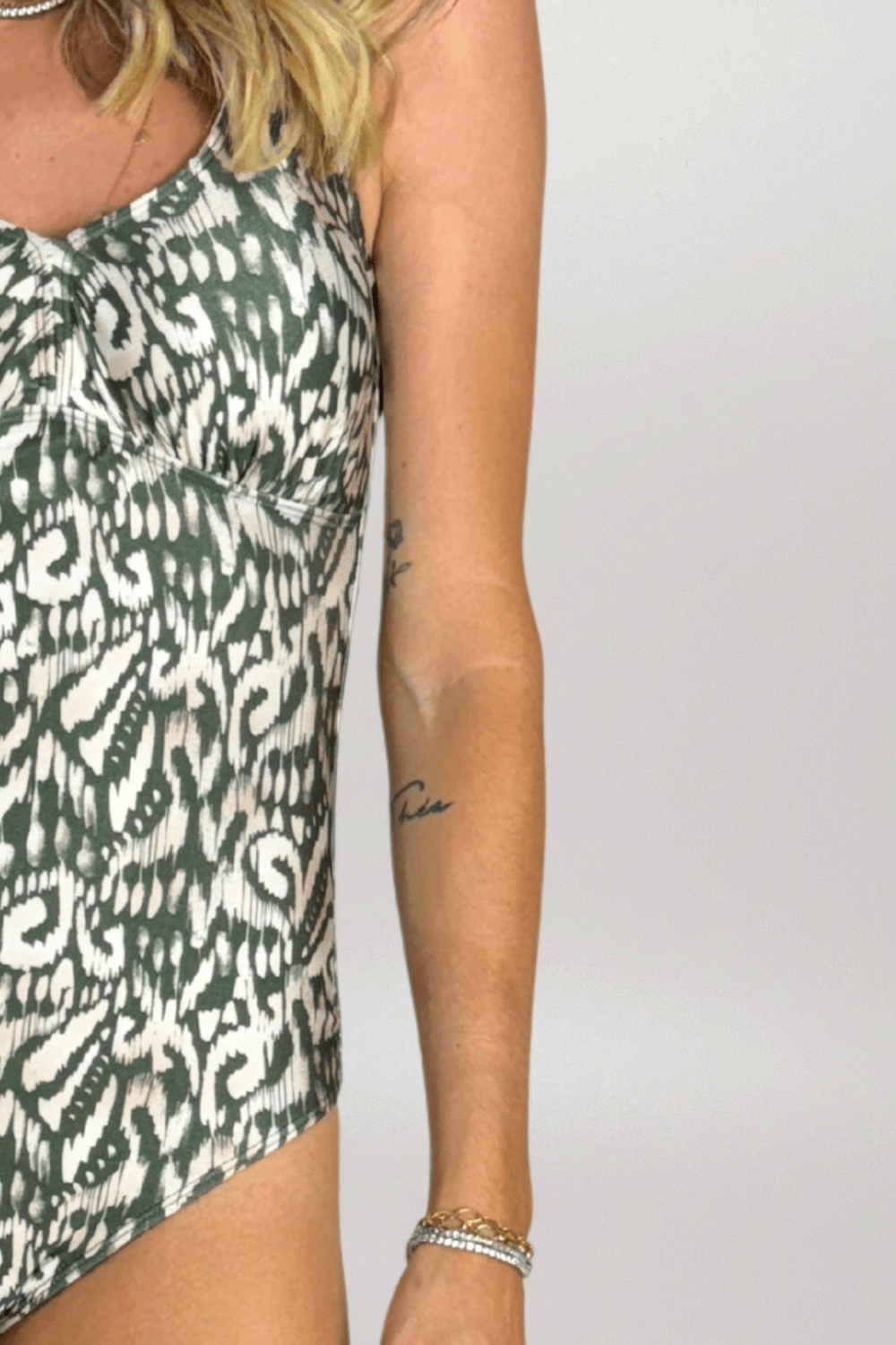 Elegante, versátil e atemporal. O Maiô Leblon é aquele modelo coringa que une sofisticação e conforto em cada detalhe. Com decote frontal delicado e barra estratégica abaixo do busto, ele valoriza a silhueta de forma natural, oferecendo sustentação e um caimento impecável. O grande destaque fica por conta do decote profundo nas costas, que traz um toque moderno e sensual na medida certa. Confeccionado em tecido de alta qualidade, possui leve brilho e textura elegante, garantindo conforto, elasticidade e excelente ajuste ao corpo. Estampa abstrata em tons de verde musgo e off white, o forro é nude.