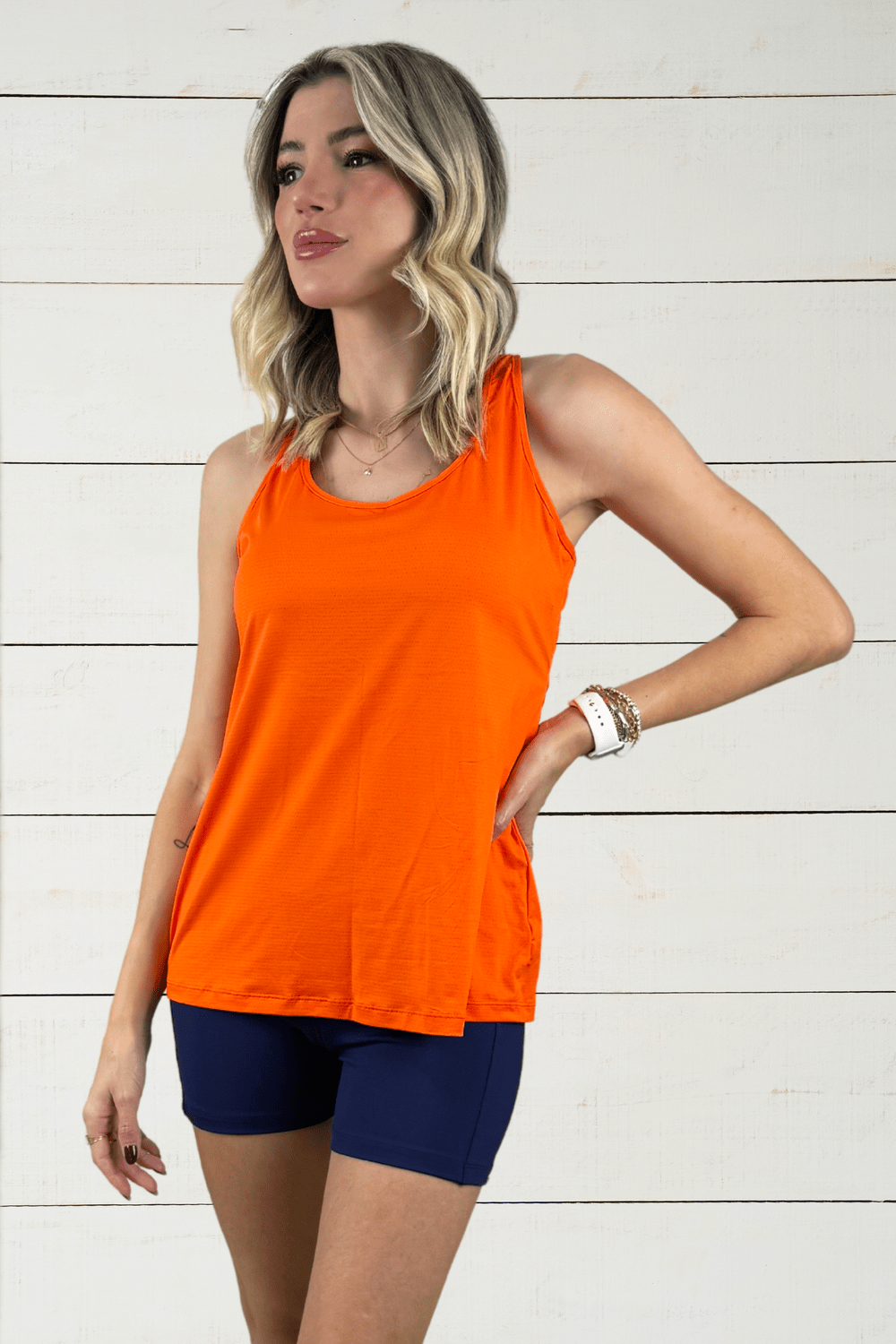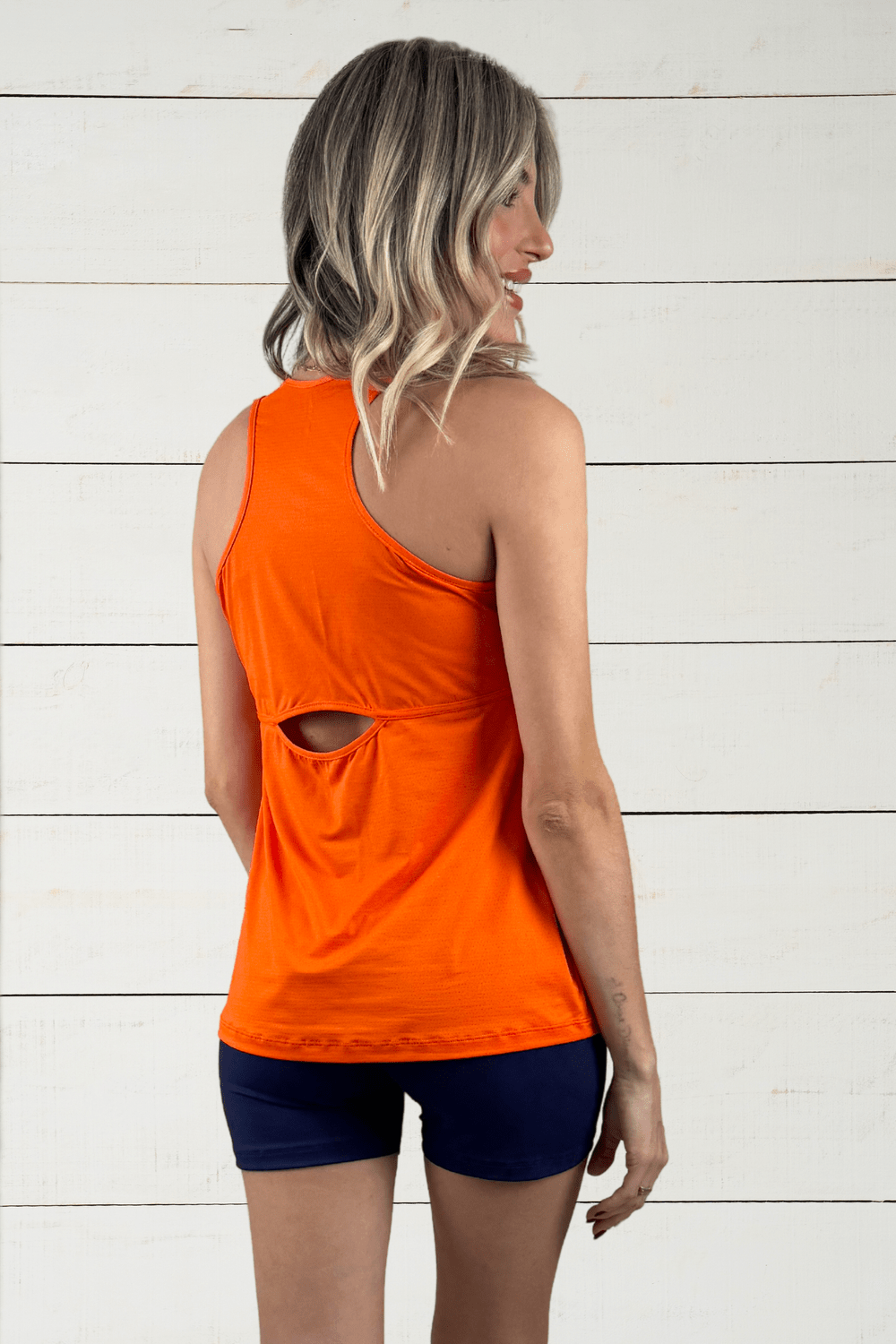 Leve, versátil, necessária! Regatas são sempre bem vindas nos dias mais quentes, quem não gosta de treinar apenas com top, e de preferência com um bom tecido, que respira, como é o caso da Regata Isabela. Na clássica modelagem regata, conta com detalhe nas costas, uma pequena abertura em formato de meia lua garantindo uma maior leveza à peça. Cor laranja.