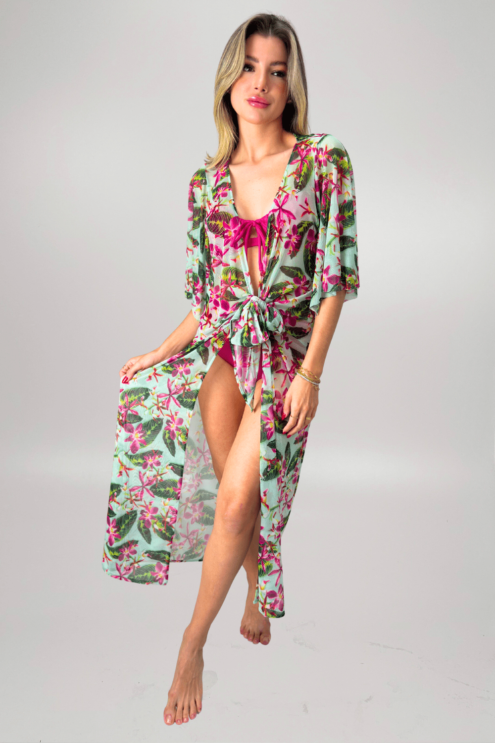 Leveza e sofisticação em cada detalhe. A saída Palmeiras em modelagem longa é perfeita para compor um visual elegante à beira-mar ou à beira da piscina. Com design fluido e abertura frontal, ela proporciona amarração na cintura, permitindo ajustar o caimento conforme o seu estilo — mais solto ou marcando a silhueta. As mangas amplas trazem um toque de charme e movimento, tornando a peça ainda mais sofisticada e confortável para os dias de verão. Ideal para usar por cima de biquínis e maiôs, essa saída de praia une praticidade e elegância com muita leveza. Em vibrante estampa floral em tons de verde e fúcsia.