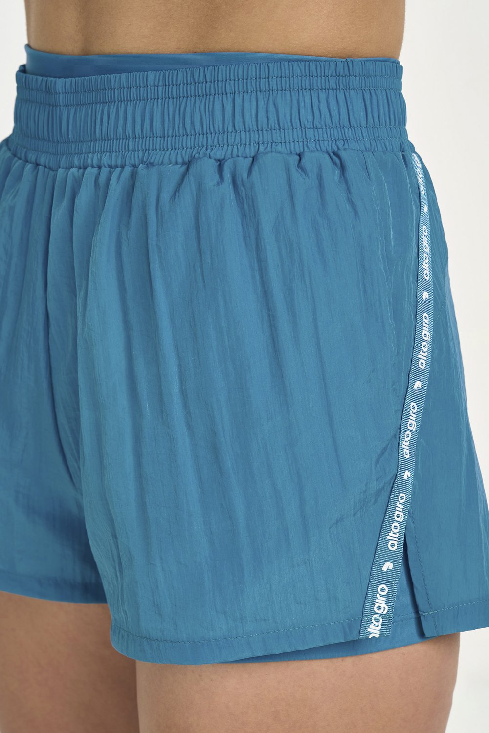 Literalmente 2 shorts em 1, eles são separados. O de baixo, com cintura alta, em tecido de alta compressão e a praticidade de um bolso na lateral. O shorts sobreposto em tecido leve, modelagem soltinha e recorte na lateral. Conta com bolsos, cós com elástico e detalhe de fita personalizada AG nas laterais. Cor azul petróleo. Uma peça versátil e que oferece toda a liberdade e conforto necessários na hora do treino.