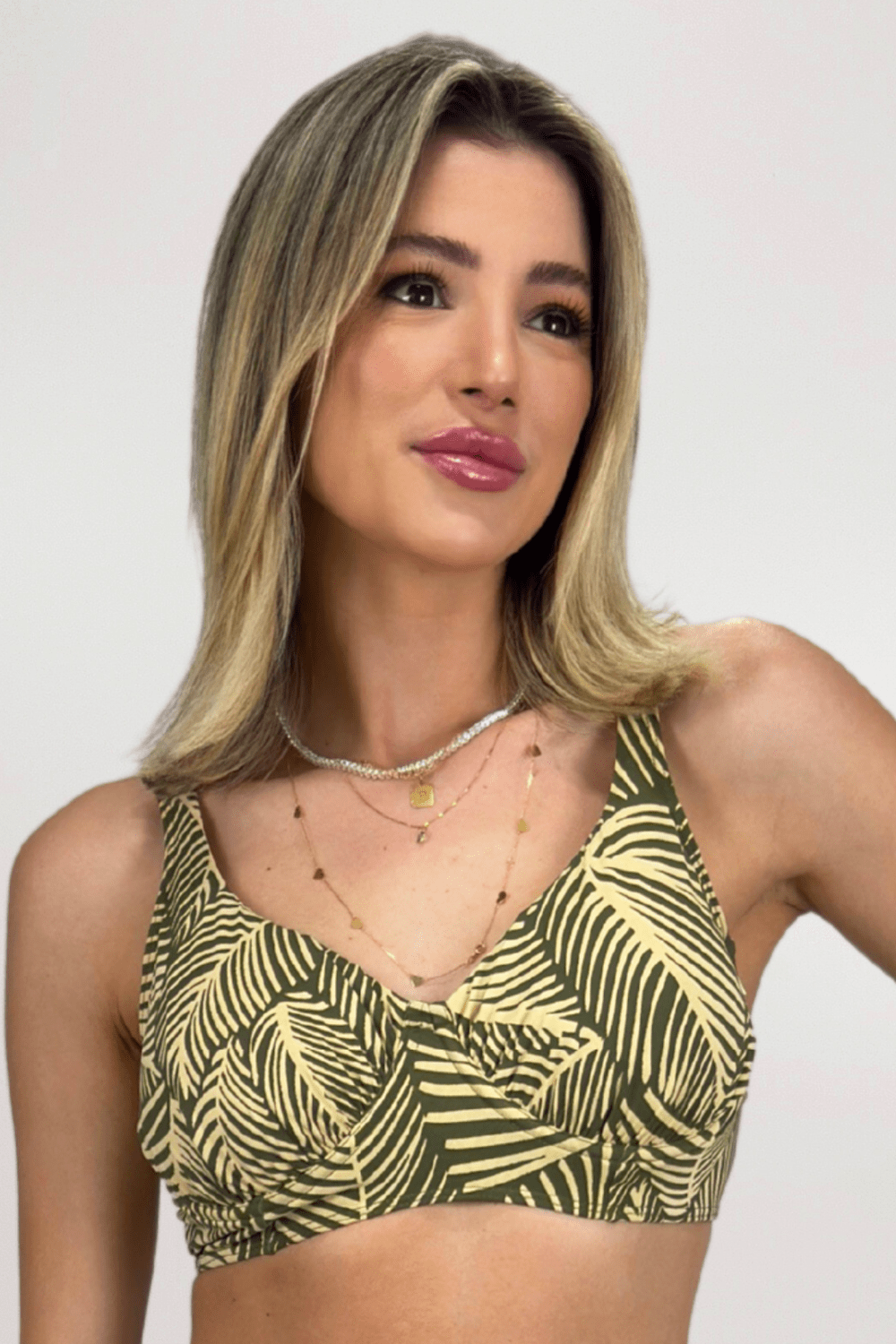 Com design que une sustentação e charme, Amores é ideal para quem busca mais segurança e conforto sem abrir mão do estilo. A modelagem reforçada oferece firmeza e estrutura, perfeita para quem tem seios maiores ou prefere um encaixe mais estável. O franzido delicado na parte da frente valoriza o busto e adiciona um toque elegante ao visual. Possui bojo e aro, que modelam suavemente, garantindo sustentação extra. Ideal para dias de sol com muito estilo e confiança. Laterais também são mais largas, com fecho em gancho nas costas. Em elegante estampa de folhas em tons de amarelo e verde musgo, o forro é nude.