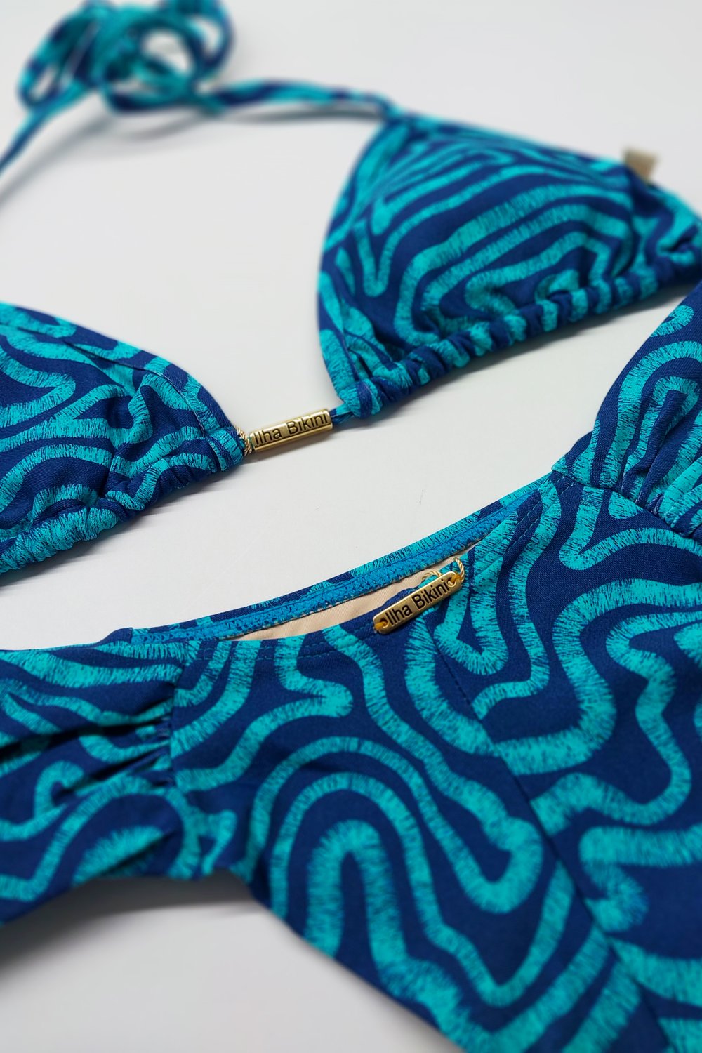 Sutiã Farol, o sempre amado Cortininha, em estampa azul marinho. Alças com acabamento de ponteiras douradas e acessório na frente são o complemento perfeito para essa peça que nunca sai de moda. Possui bojo removível permitindo que você escolha o caimento ideal para o seu corpo.