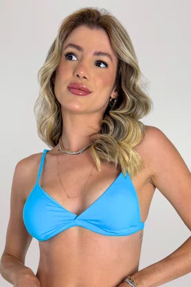 Numa versão diferenciada do sutiã fixo, o Laguna: as alças podem ser ajustadas e também com a opção de amarrar no pescoço, já que a mesma é removível. Bojo e detalhes em dourado dão o acabamento perfeito na essa peça, que vai ser sucesso nesse verão! Na cor azul celeste, o forro é nude.