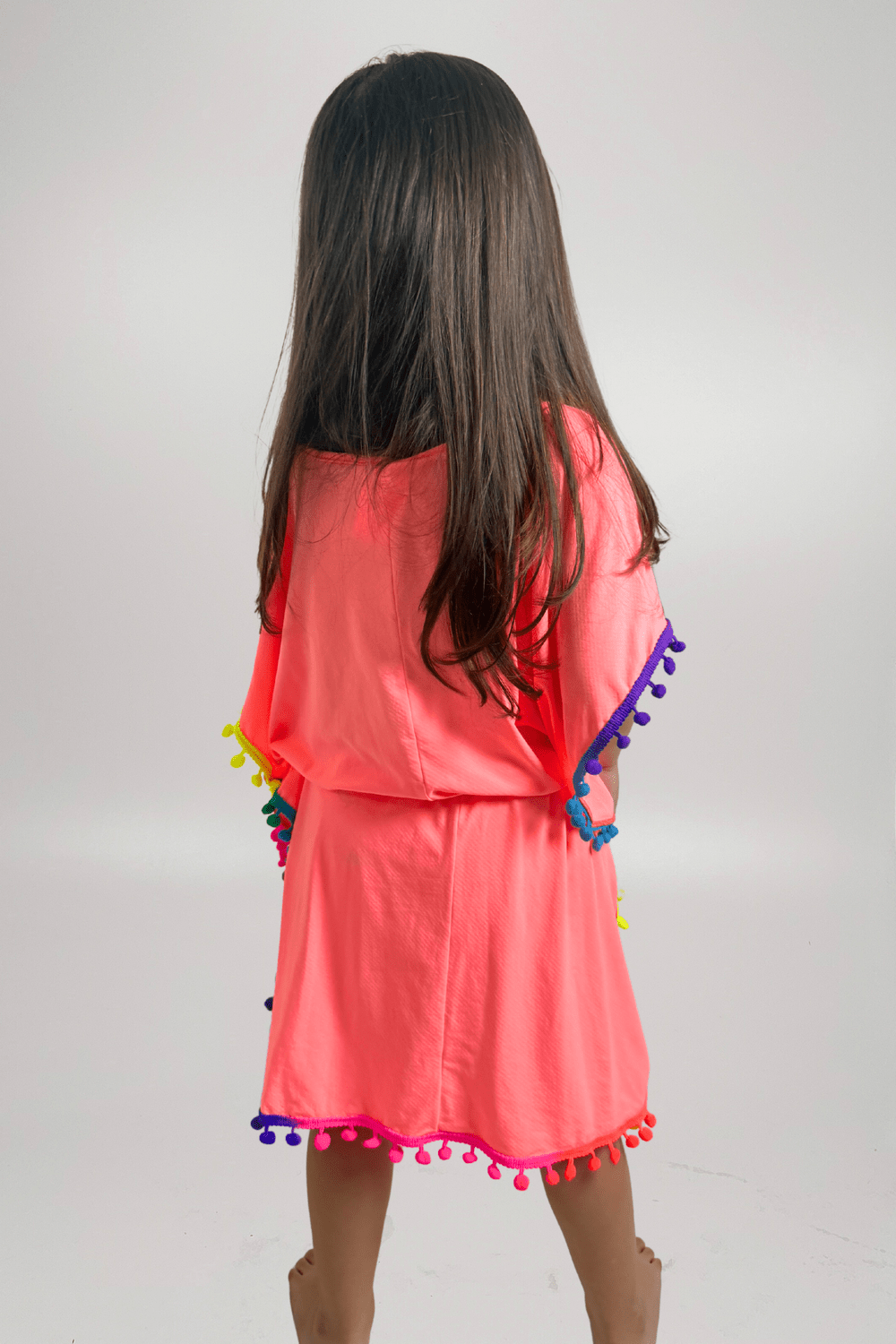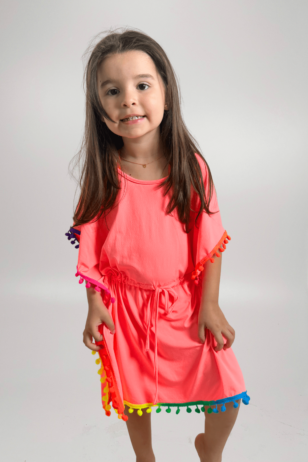 A saída de praia perfeita para acompanhar as pequenas em todos os momentos do verão! Feita em tecido leve e fresquinho, ela garante conforto após o banho de mar ou piscina. O modelo soltinho com ajuste na cintura permite vestir com facilidade e se adaptar ao corpo, deixando a criança livre para brincar. O charme fica por conta dos pompons coloridos na barra e nas mangas, que trazem um toque divertido e super delicado. A cor vibrante deixa o look ainda mais alegre e cheio de personalidade. Ideal para usar por cima do biquíni ou maiô, em passeios na praia, clube ou férias. Uma peça prática, estilosa e indispensável no guarda-roupa de verão das pequenas!